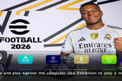 Play eFootball PES 2026 PPSSPP Android Offline with 25/26 season updates, UEFA Champions League and league kits, realistic 4K graphics, and complete player transfers for mobile football fans.