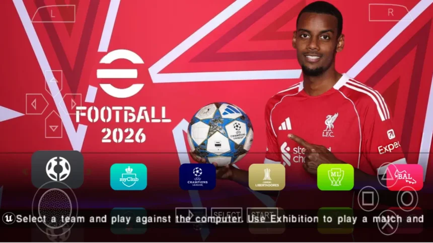 Play eFootball PES 2026 PPSSPP on Android with offline mode, fully updated 25/26 season rosters, UEFA Champions League kits, domestic leagues, and ultra-realistic 4K graphics.